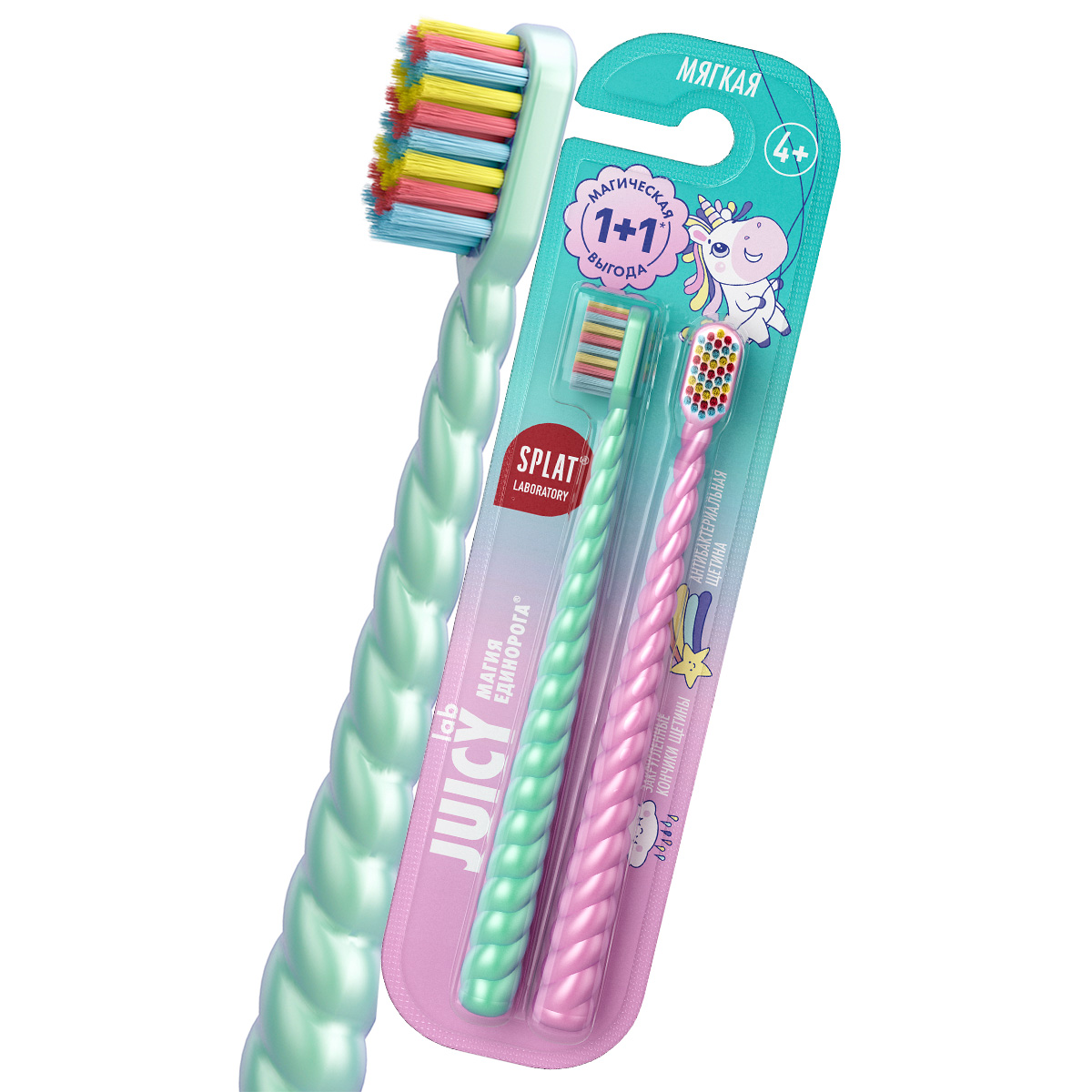 Детская зубная щетка серии JUICY LAB «SPLAT UniMagic / Магия единорога» с ионами серебра. Pearl / Жемчужная, набор 2 шт.