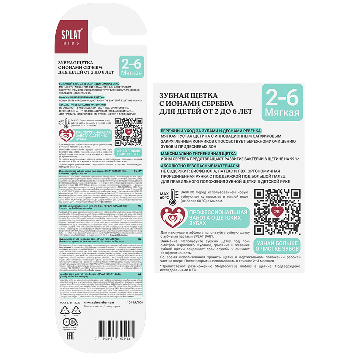 Детская зубная щетка SPLAT Kids 2-6 – бережный уход за зубками вашего ребенка! Прорезиненная ручка эргономичной формы обеспечивает комфортную и безопасную чистку зубов детской рукой, а присоска отвечает за гигиеничное хранение. Мягкая густая щетина бережно очищает эмаль молочных зубов и придесневые зоны Разработано совместно с детскими стоматологами. Детская зубная щетка разработана специально для ухода за полостью рта малышей от 2 лет. Подходит для ежедневной чистки зубов и обеспечивает бережное отношение к чувствительным деснам. Благодаря инновационным технологиям с использованием ионов серебра она помогает поддерживать гигиену на высоком уровне. Мягкие щетинки эффективно удаляют налет, не повреждая эмаль, что особенно важно для детских зубов. Подходит для детей старше 2 лет, помогая формировать полезные привычки ухода за зубами с раннего возраста.