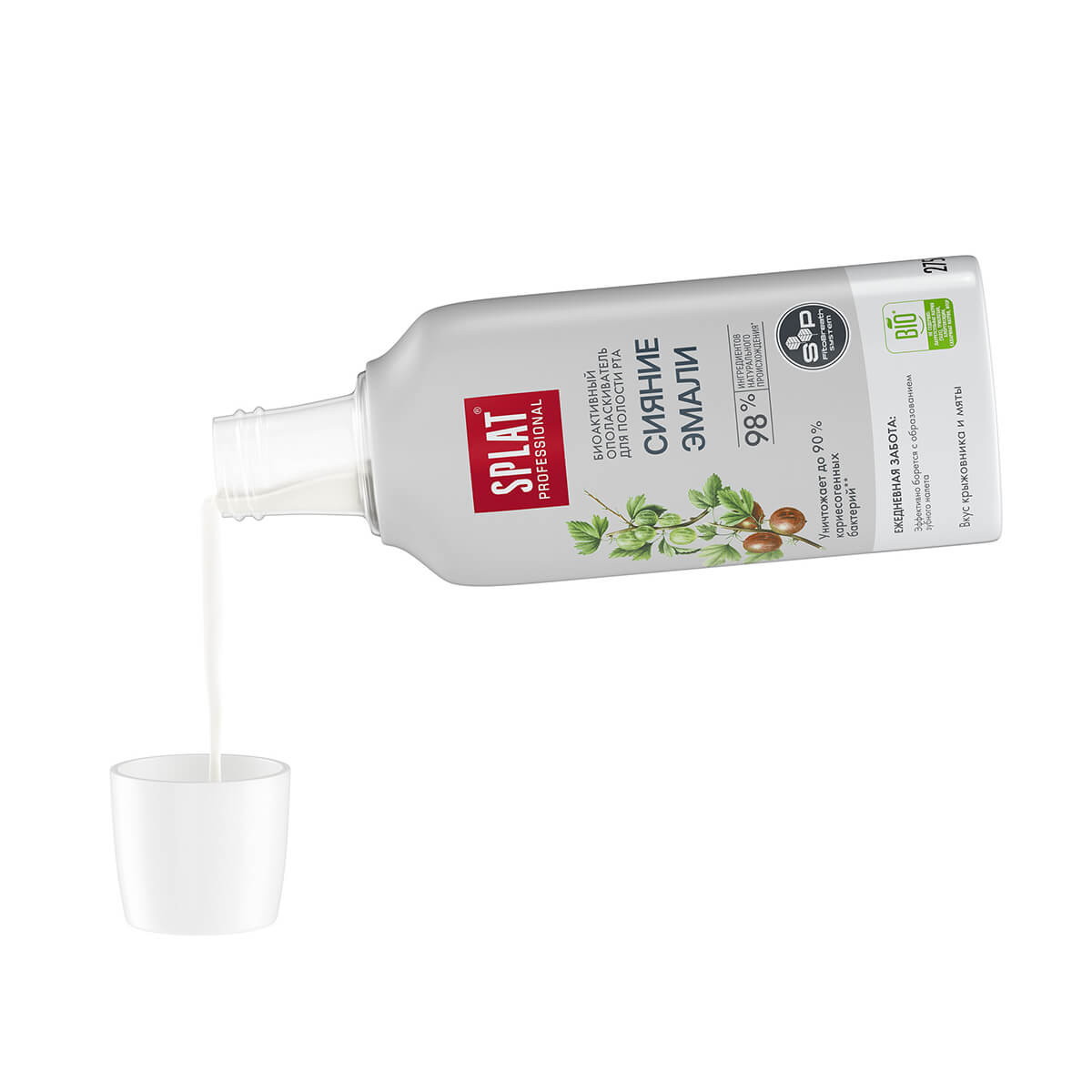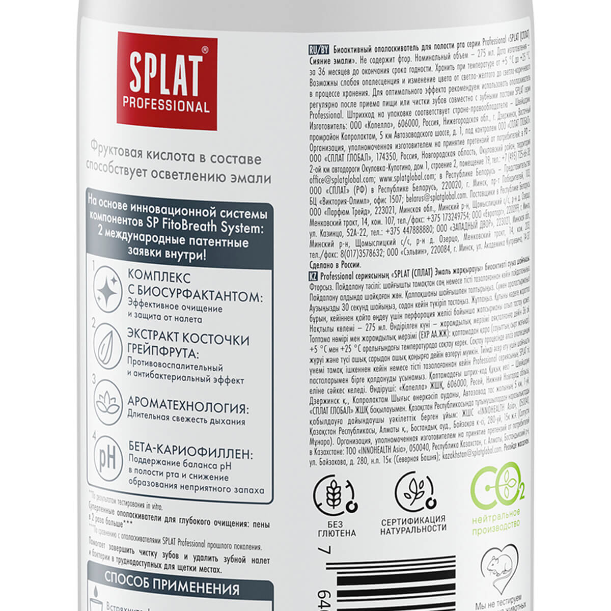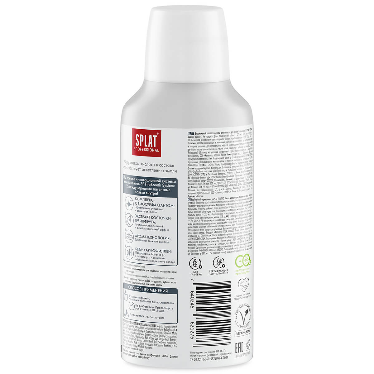 Инновационный ополаскиватель для полости рта SPLAT Professional содержит уникальную систему активов SP. FitoBreath System, что включает в себя комбинацию специальных ПАВ. Эта комбинация создает пену для эффективного очищения от налета и остатков пищи, тем самым эффективно предотвращая рост кариесогенных бактерий, а также поддерживает здоровье десен и пролонгирует свежее дыхание и чистоту зубов. Активы в SP. FitoBreath System также отвечают и за долгое сохранение свежести дыхания, противовоспалительный эффект и поддержания баланса pH в полости рта, тем самым улучшая гигиену.