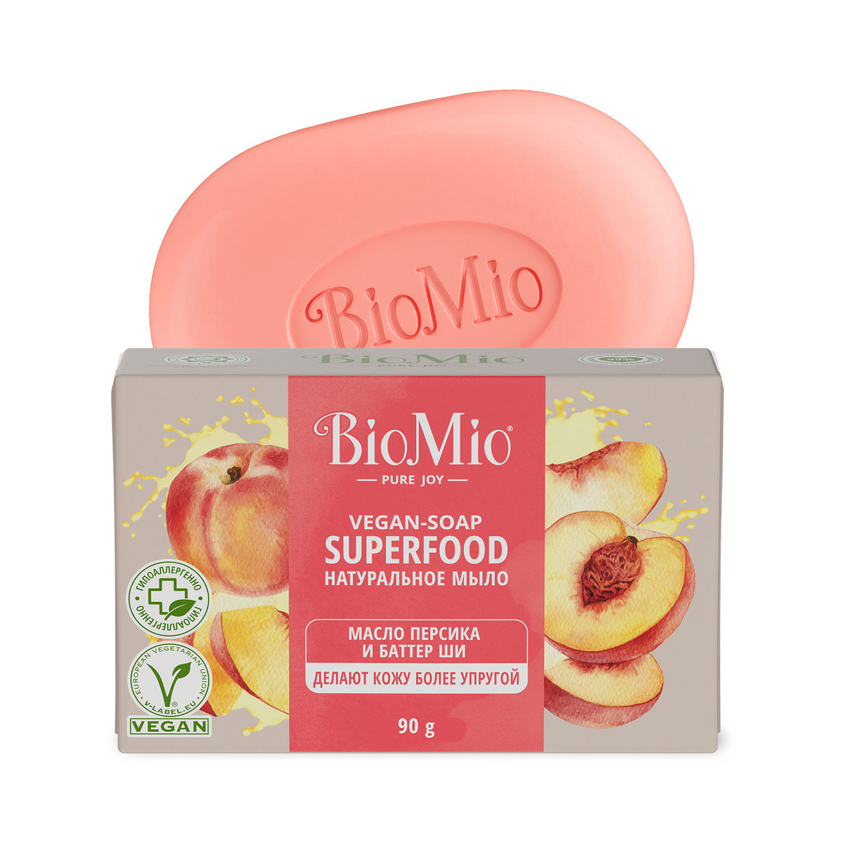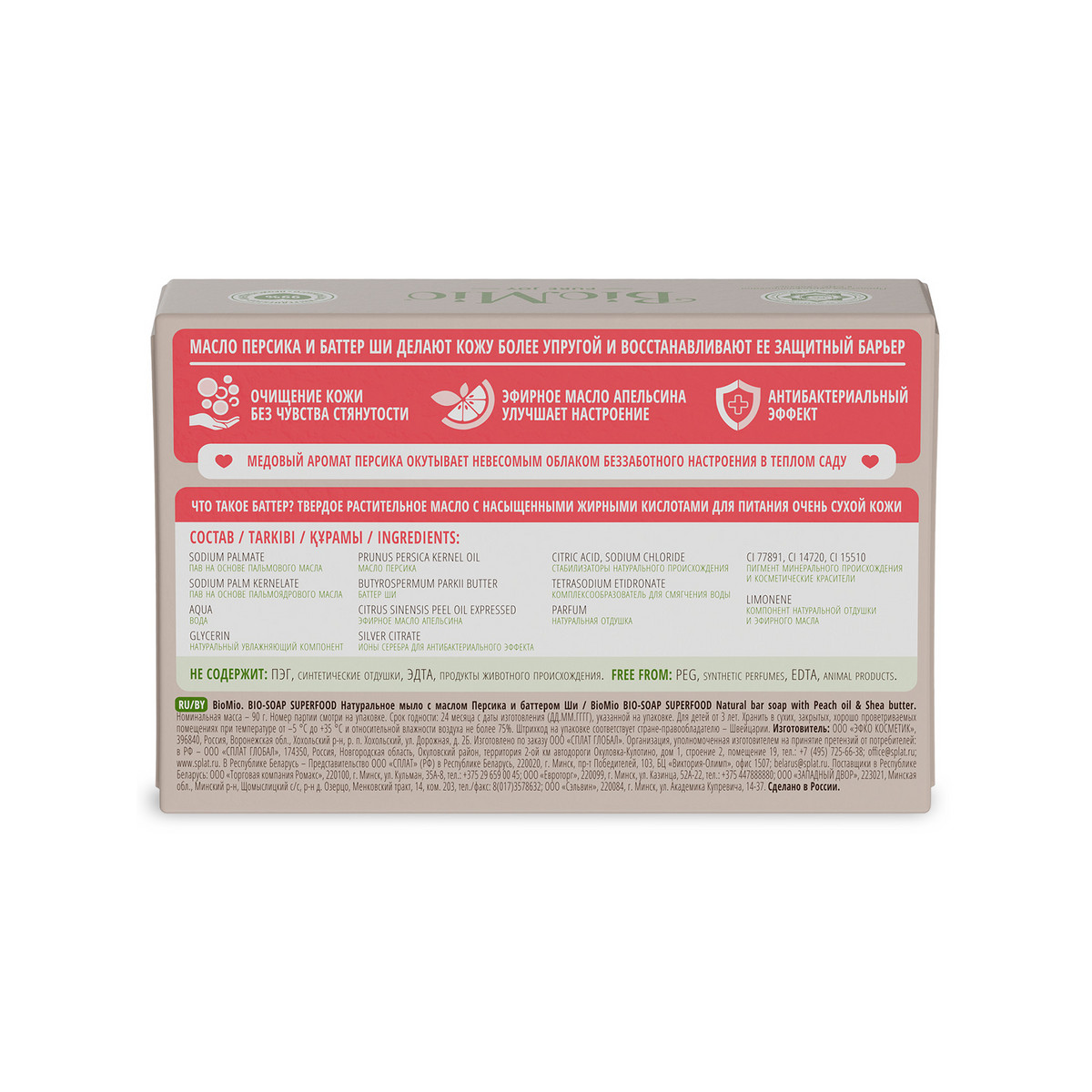 Натуральное веганское мыло BioMio SUPERFOOD очищает кожу без чувства стянутости. В составе — баттер ши. Это твердое масло с насыщенными жирными кислотами для ухода за кожей и восстановления ее защитного барьера. Масло персика делает кожу более упругой. Ионы серебра оказывают мягкий антибактериальный эффект. Медовый аромат персика окутывает невесомым облаком беззаботного настроения.
