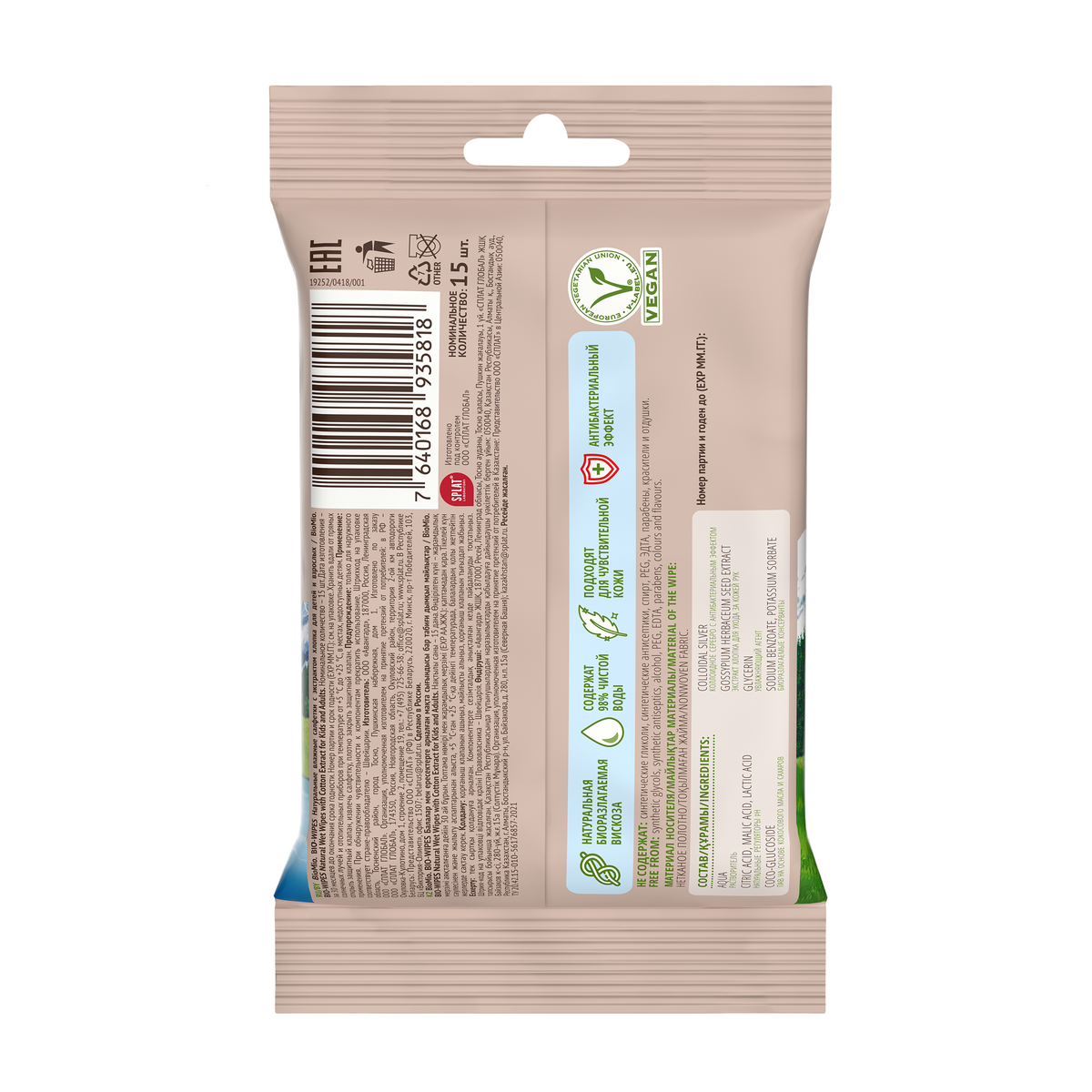 Влажные салфетки не содержат: синтетические гликоли, синтетические атисептики, спирт, PEG, ЭДТА, парабены, красители и отдушки.