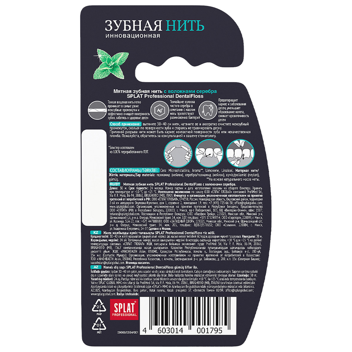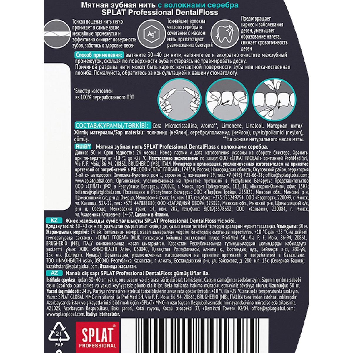 Супертонкий флосс с волокнами серебра проникает в труднодоступные участки даже при скученности зубов. Структура нити препятствует ее расслоению и разрывам, а дополнительная пропитка ионами серебра обеспечивает антисептическое действие. Семь тонких волокон серебра в сочетании с экстрактом мяты оказывают двойное антибактериальное действие и препятствует размножению бактерий (подтверждено тестами in vitro). СДЕЛАНО В ИТАЛИИ.
