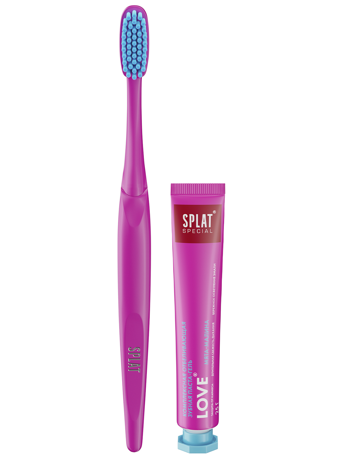 2) Зубная паста-гель SPLAT Special «Любовь» (LOVE) с малиновым ароматом — для счастливых влюбленных! Она освежает дыхание, бережно осветляет эмаль. Содержит экстракт семян периллы, который оказывает противовоспалительное и антибактериальное действие. Округлые абразивные частицы бережно очищают, полируют и слегка отбеливают эмаль