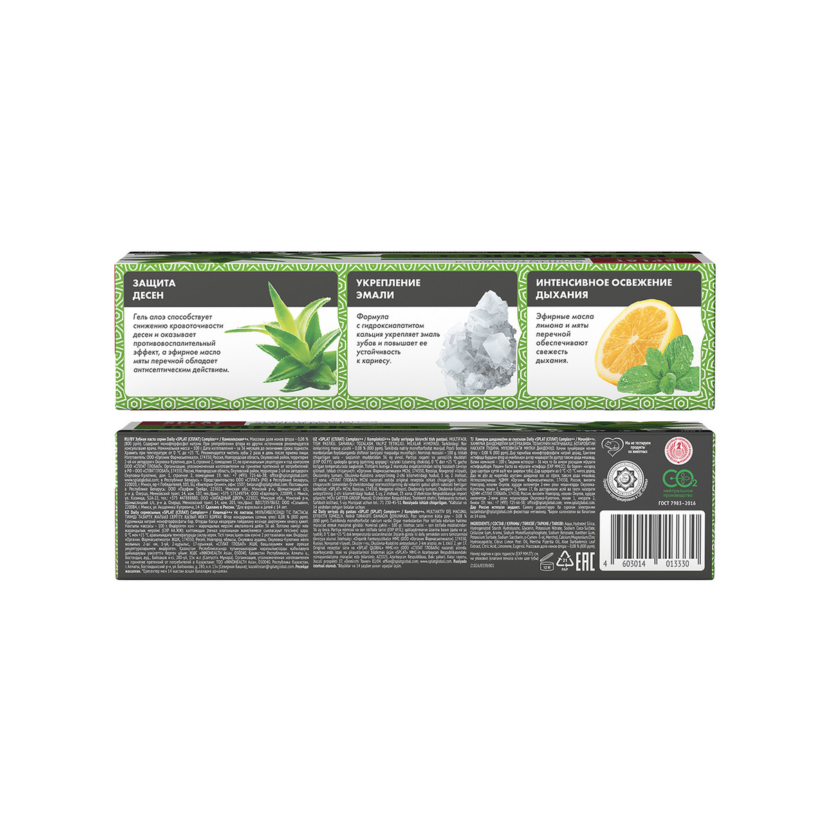 Aqua, Hydrated Silica, Hydrogenated Starch Hydrolysate, Glycerin, Potassium Nitrate, Sodium Coco-Sulfate, Cellulose Gum, Aroma, Sodium Monofluorophosphate, Sodium Benzoate, Xanthan Gum, Potassium Sorbate, Sodium Saccharin, O-cymen-5-ol, Menthol, Calcium/Magnesium/Zinc Hydroxyapatite, Citrus Limon Peel Oil, Mentha Piperita Oil, Aloe Barbadensis Leaf Extract, Citric Acid, Limonene, Eugenol. Fluoride content – 0,08 % (800 ppm).