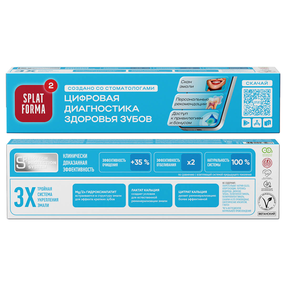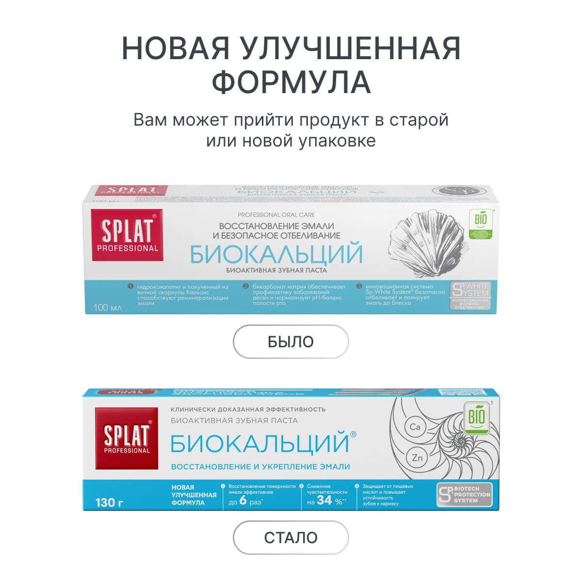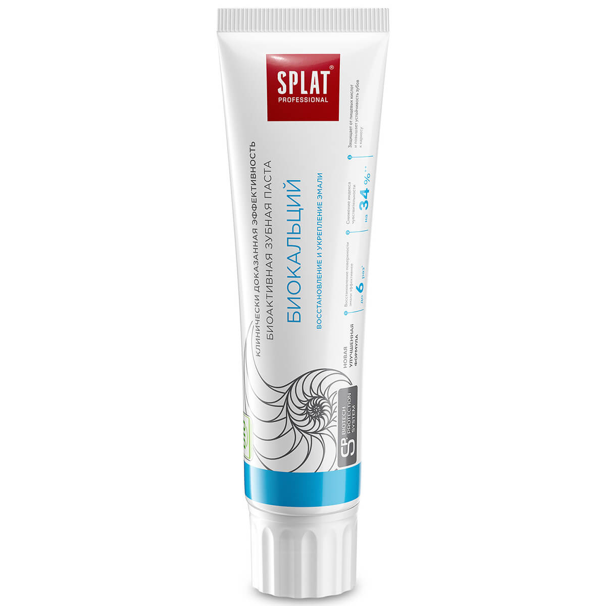 Ваша любимая зубная паста SPLAT (СПЛАТ) Professional БИОКАЛЬЦИЙ теперь представлена в обновленном исполнении: улучшенная формула с инновационными компонентами и современный дизайн упаковки. Продукт протестирован клинически. Новая формула содержит два комплекса активов для эффективной чистки зубов: инновационный комплекс SP Biotech protection System и тройную систему компонентов проактивного действия для реминерализации эмали.