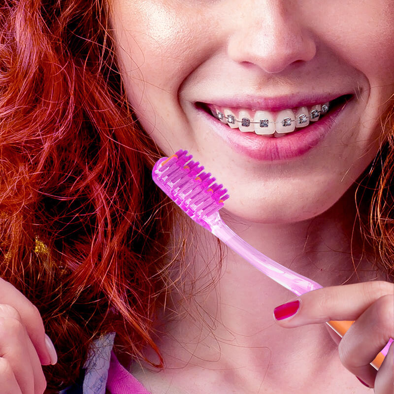 Короткие и более жёсткие щетинки в центре — для вычищения пространства между брекетами и эмалью зуба. Высокие спиральные щетинки по краям — для бережной заботы о дёснах и эффективного очищения эмали
