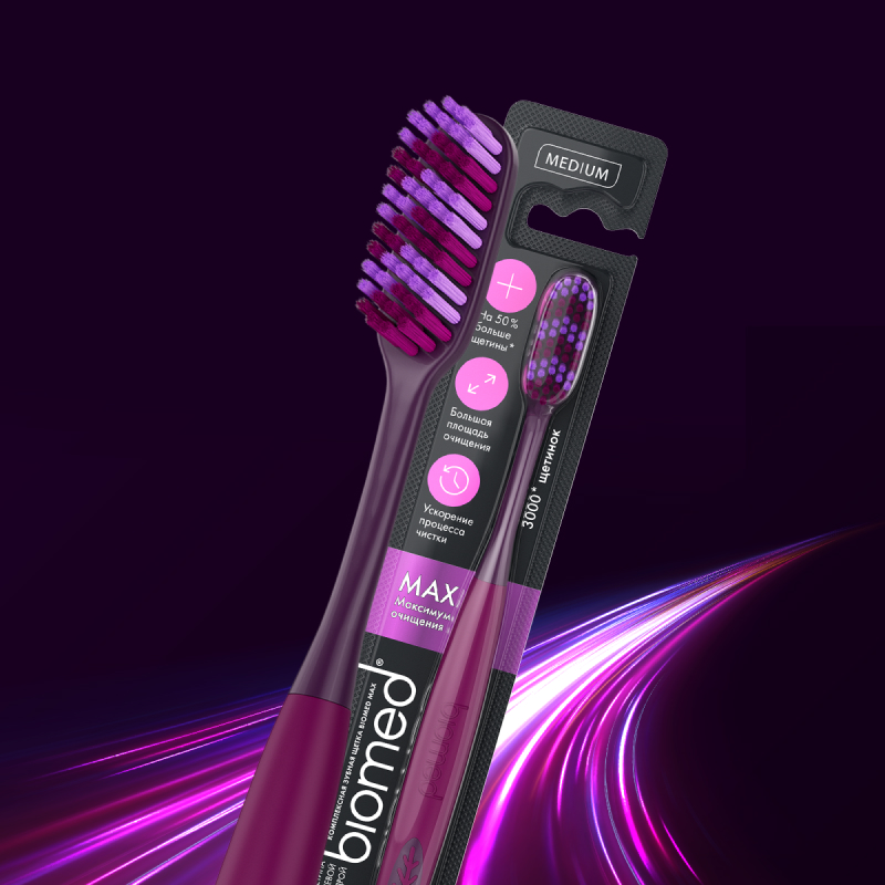 Зубная щетка Biomed MAX очищает больше зубов за одно движение. Более 3000 щетинок, покрытых кремниевой пудрой, гарантируют эффективное удаление налета. Закругленные кончики щетинок прошли 6 стадий шлифовки и 2 полировки сапфировыми дисками, обеспечивая безопасную и бережную чистку зубов и десен.