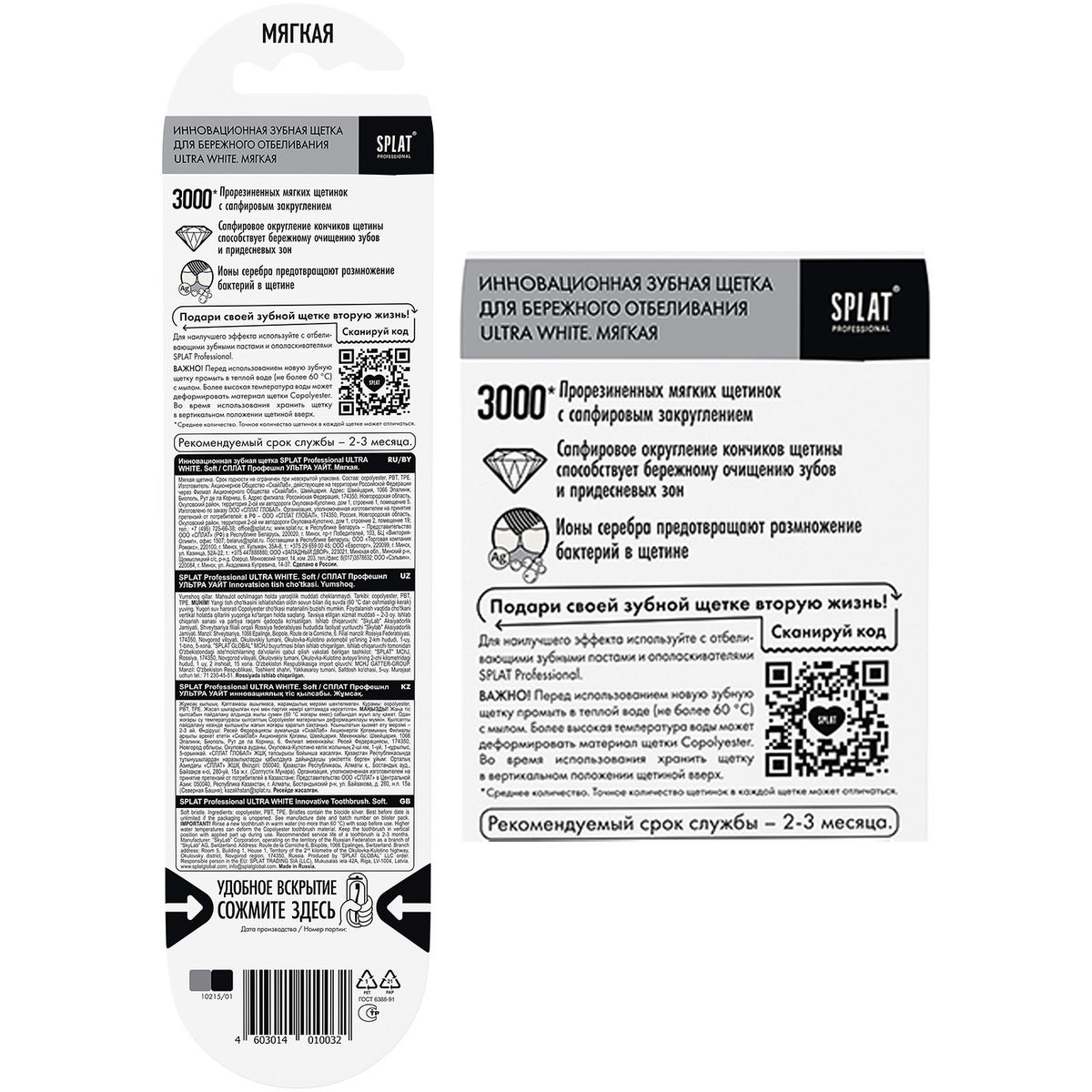Зубная щетка SPLAT Professional ULTRA WHITE с мягкой прорезиненной антибактериальной щетиной бережно ухаживает за чувствительными зубами. 2500 ультратонких щетинок с уникальным резиновым покрытием очищают от налета до белизны (на 40% эффективнее щетки с обычной щетиной). Закругленные кончики щетины не травмируют эмаль и гарантируют безопасность чистки.